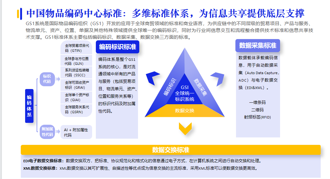 統(tǒng)一物品編碼標(biāo)準(zhǔn)一直是采購供應(yīng)鏈領(lǐng)域的重點(diǎn)和難點(diǎn)。中國物品編碼中心的GS1系統(tǒng)是國際物品編碼組織(GS1)開發(fā)的應(yīng)用于全球商貿(mào)領(lǐng)域的標(biāo)準(zhǔn)和商業(yè)語言,為供應(yīng)鏈中的不同層級的貿(mào)易項(xiàng)目、產(chǎn)品與服務(wù)、物流單元、資產(chǎn)、位置、單據(jù)及其他特殊領(lǐng)域提供全球唯一的編碼標(biāo)識,同時(shí)為行業(yè)間信息交互和流程整合提供技術(shù)標(biāo)準(zhǔn)和信息共享技術(shù)支撐。