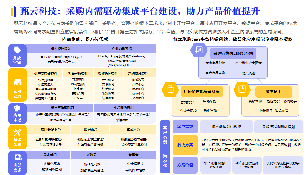 再例如,甄云科技通過全方位考慮采購的需求部門、采購者、管理者的根本需求來定制化開放平臺,實(shí)現(xiàn)供方資源接入和企業(yè)內(nèi)部系統(tǒng)的全局協(xié)同。