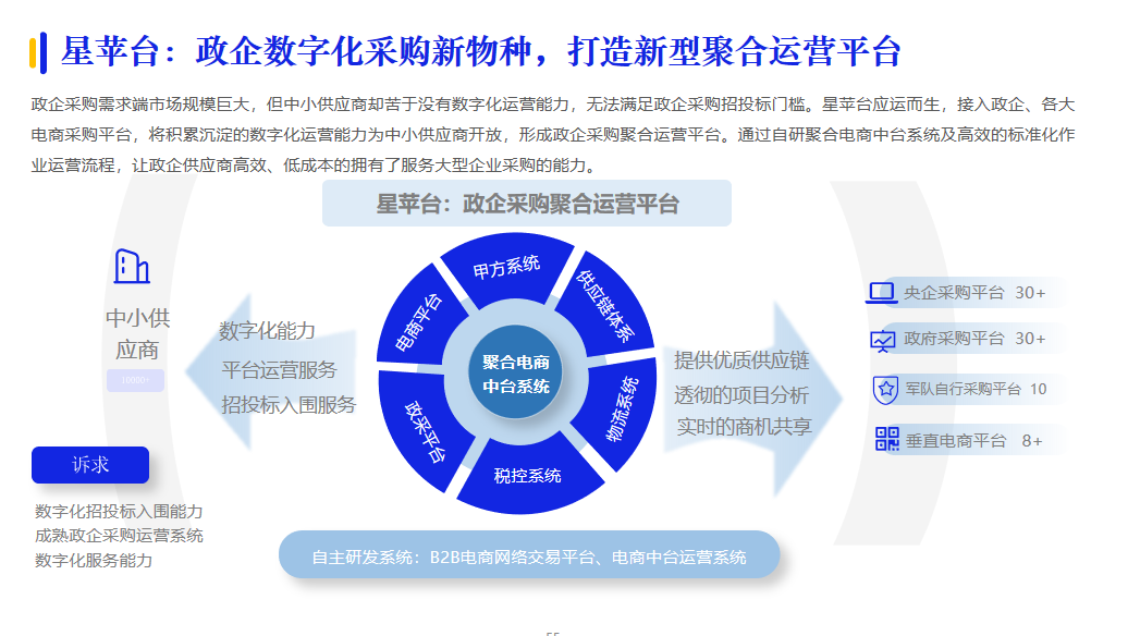 業(yè)務(wù)+數(shù)據(jù)的雙中臺模式,也是今年技術(shù)服務(wù)商在中臺方面的創(chuàng)新看點(diǎn)。從業(yè)務(wù)系統(tǒng)獲取的信息經(jīng)過數(shù)據(jù)中臺的處理,再經(jīng)過業(yè)務(wù)中臺的分析后,為企業(yè)提供智能決策支持。例如,星蘋臺通過自研聚合電商中臺系統(tǒng),接入政企、各大電商采購平臺,將積累沉淀的數(shù)字化運(yùn)營能力為中小供應(yīng)商開放,讓其擁有了服務(wù)大型企業(yè)采購的能力。