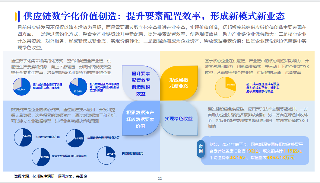 目前供應(yīng)鏈發(fā)展不僅僅以降本增效為目標(biāo),而是需要通過數(shù)字化變革推進(jìn)產(chǎn)業(yè)變革,實(shí)現(xiàn)價(jià)值創(chuàng)造。億邦智庫總結(jié)供應(yīng)鏈價(jià)值創(chuàng)造主要表現(xiàn)在四方面,一是通過集約化方式,整合全產(chǎn)業(yè)鏈資源并重新配置,提升要素配置效率,創(chuàng)造規(guī)模效益,助力產(chǎn)業(yè)鏈企業(yè)做強(qiáng)做大;二是核心企業(yè)開放其資源,對外服務(wù),形成新模式新業(yè)態(tài),實(shí)現(xiàn)價(jià)值轉(zhuǎn)化;三是數(shù)據(jù)逐漸成為企業(yè)資產(chǎn),釋放數(shù)據(jù)要素價(jià)值;四是企業(yè)建設(shè)綠色供應(yīng)鏈中實(shí)現(xiàn)綠色收益。