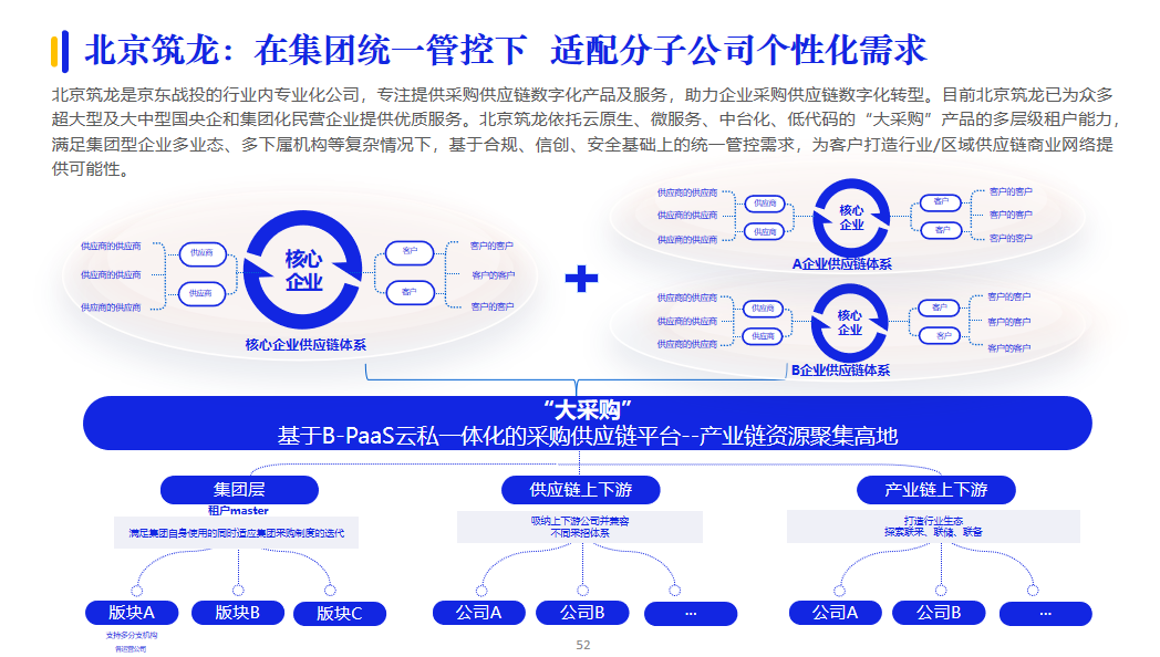 針對企業(yè)既要滿足標(biāo)準(zhǔn)化,又要滿足定制化業(yè)務(wù)需求,PaaS提供的服務(wù)更具有拓展性、集中性、適配性更強(qiáng)。北京筑龍基于多租戶體系,構(gòu)建了大采購云私一體化B-PaaS平臺,既滿足多層級集中管理管控需求,又為下屬管理及執(zhí)行機(jī)構(gòu)提供更多個(gè)性化、自主性選擇,進(jìn)而適應(yīng)集團(tuán)多元化和業(yè)務(wù)單元專業(yè)化發(fā)展。