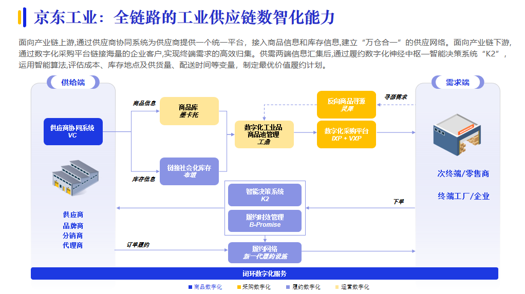 數(shù)字供應(yīng)鏈發(fā)展已經(jīng)從關(guān)注部分環(huán)節(jié)、部分參與者,轉(zhuǎn)向關(guān)注全鏈條、生態(tài),因此,全鏈路數(shù)智供應(yīng)鏈解決方案漸成主流。例如,京東工業(yè)面向產(chǎn)業(yè)鏈上下游,通過供應(yīng)商協(xié)同系統(tǒng)建立“萬倉合一”的供應(yīng)網(wǎng)絡(luò);通過數(shù)字化采購平臺實(shí)現(xiàn)終端需求的高效歸集,再通過智能決策系統(tǒng)“K2”,制定最優(yōu)價(jià)值履約計(jì)劃。