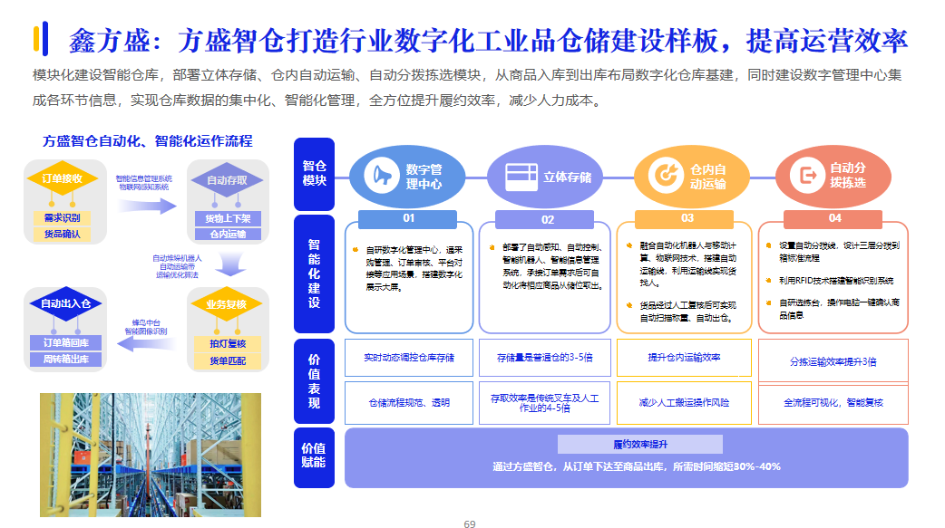 履約能力是供應(yīng)商的核心競爭力。在履約服務(wù)方面,為了提高履約交付效率,供應(yīng)商加大AI等技術(shù)投入應(yīng)用,建設(shè)智能倉儲、智慧物流等數(shù)智供應(yīng)鏈體系。例如,鑫方盛的方盛智倉打造行業(yè)數(shù)字化工業(yè)品倉儲建設(shè)樣板,實(shí)現(xiàn)倉庫數(shù)據(jù)的集中化、智能化管理,全方位提升履約效率,減少人力成本。
