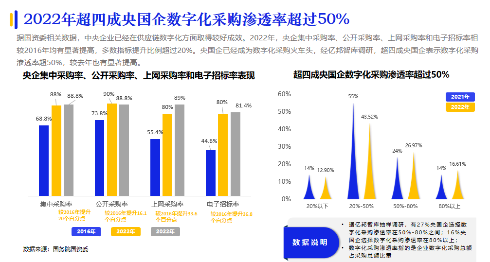 央國企在我國企業(yè)采購數(shù)字化進(jìn)程中的火車頭效應(yīng)越發(fā)明顯。據(jù)億邦智庫調(diào)研,超四成央國企表示數(shù)字化采購滲透率已經(jīng)超過50%;形成了央國企先行,引發(fā)供應(yīng)鏈各環(huán)節(jié)企業(yè)參與數(shù)字化創(chuàng)新變革的發(fā)展態(tài)勢。