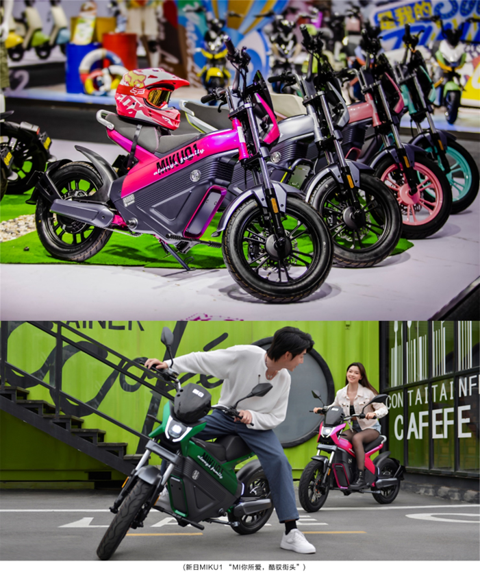 “MI你所愛(ài) 酷馭街頭”MIKU1:設(shè)計(jì)靈感來(lái)自于賽博朋克,極具未來(lái)感的機(jī)車(chē)外表,在“后現(xiàn)代迷幻美學(xué)”的賦能下,擁有了更加科幻的潮流美感,瞬間拉近與年輕人的溝通距離;