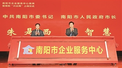 南陽市委書記朱是西(右)、市長王智慧(左)為南陽市企業(yè)服務(wù)中心揭牌